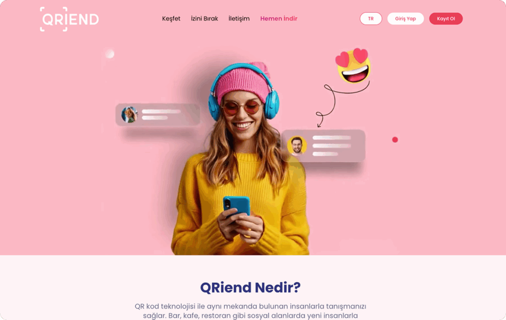 QR kod teknolojisi ile aynı mekanda bulunan insanlarla tanışmanızı sağlar. Bar, kafe, restoran gibi sosyal alanlarda yeni insanlarla tanışmak için modern ve güvenli bir platform sunar.